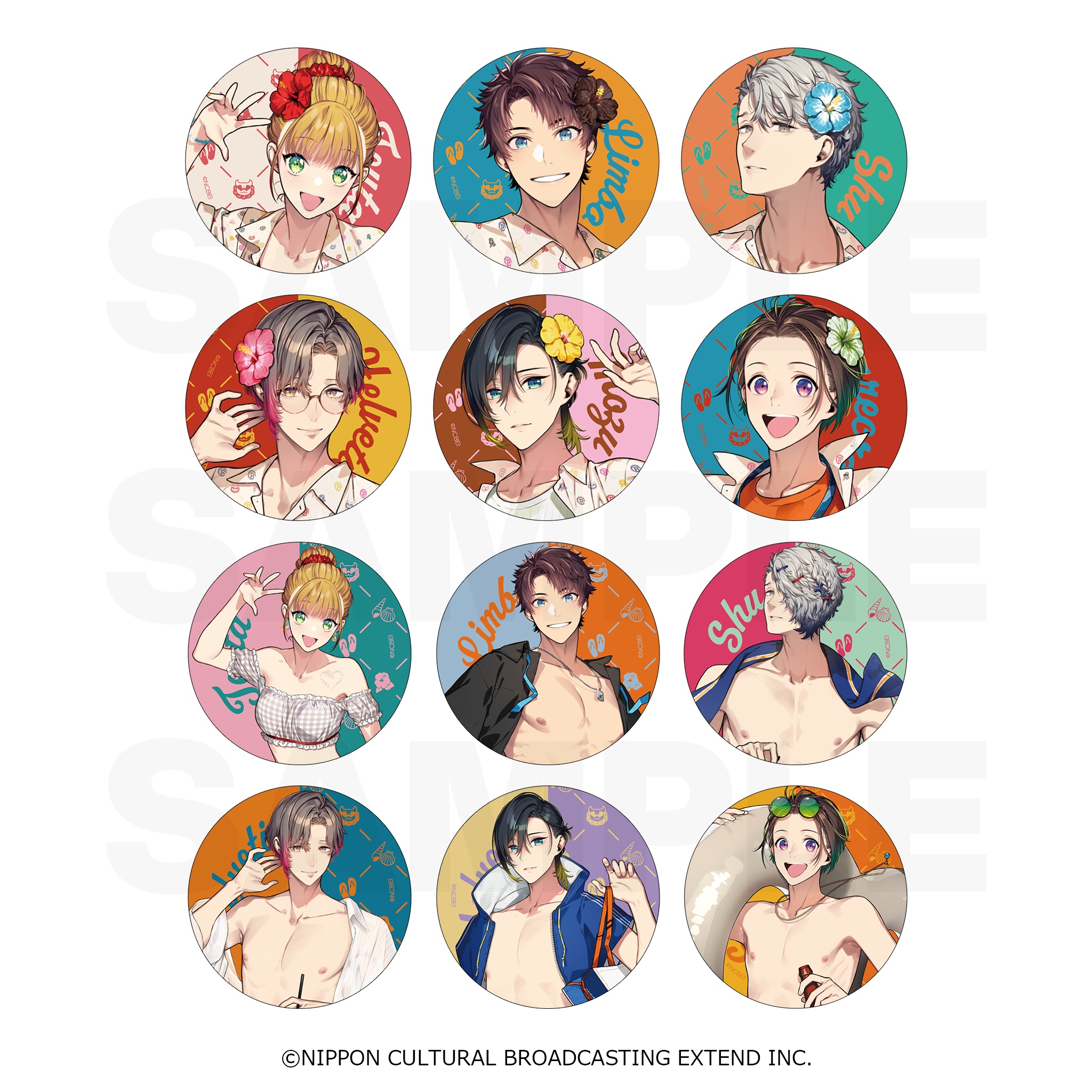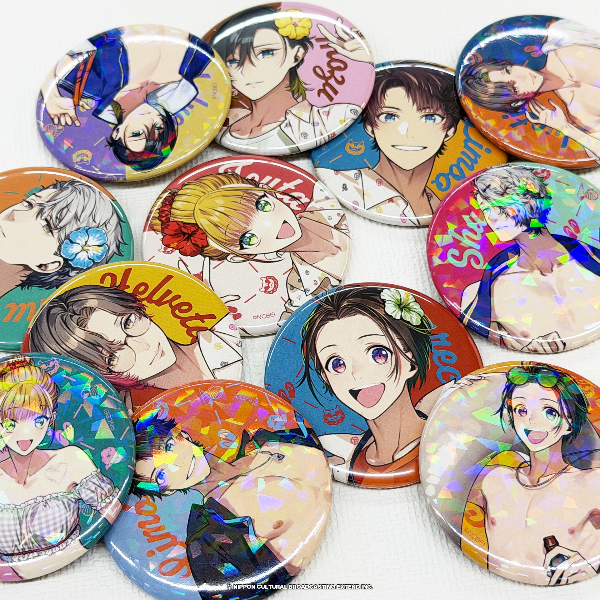 #バスタフェin沖縄 のイラストが缶バッジになりました。お揃いのシャツを着た「RESORT style」と、水着を着た「BEACH style」の2パターンで、「BEACH style」 は特別感のあるスパークル加工を施しました。