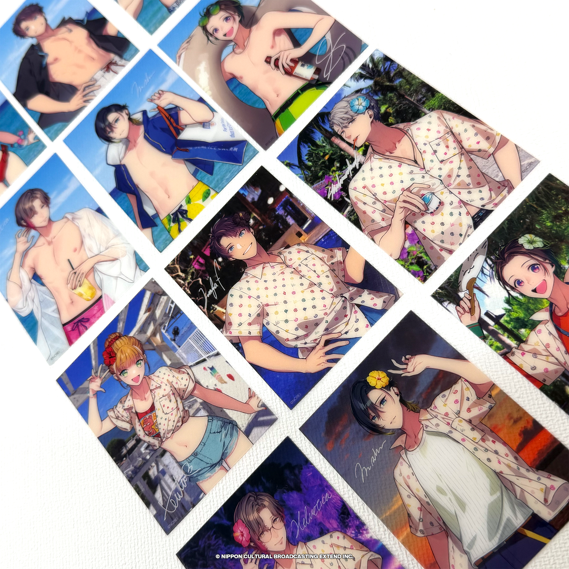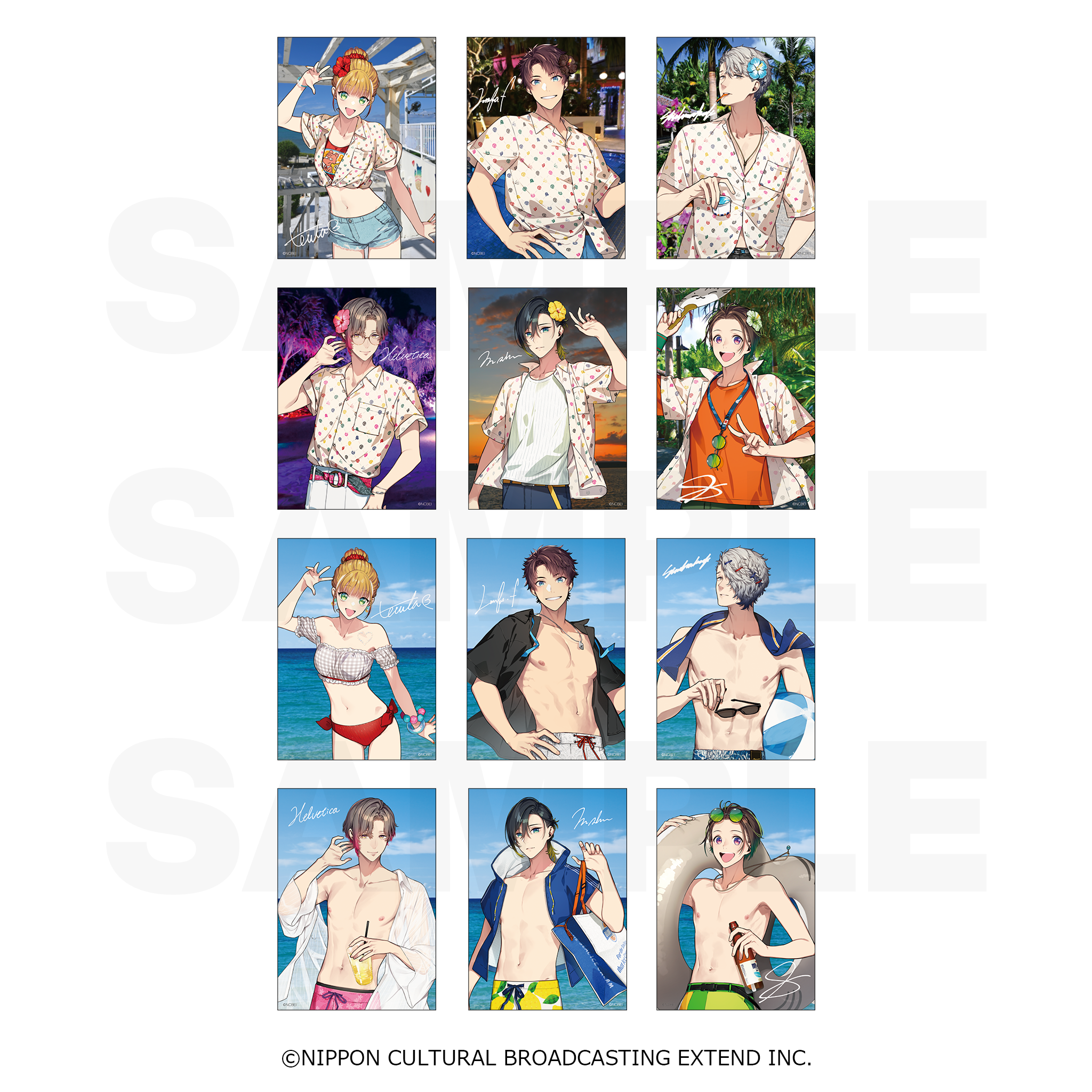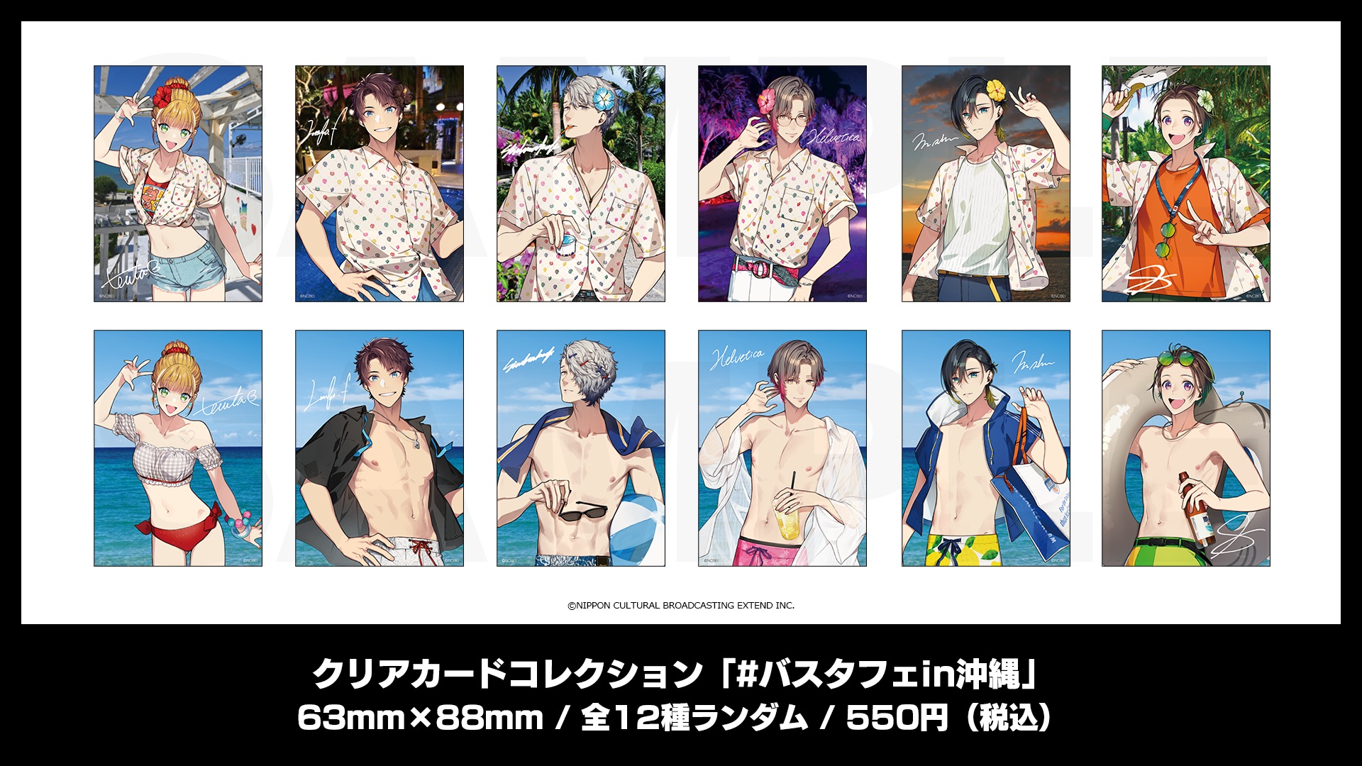 #バスタフェin沖縄 のイラストがクリアカードにになりました。お揃いのシャツを着た「RESORT style」と、水着を着た「BEACH style」の2パターンで、背景には沖縄の実際の観光スポットの写真が使用され、色鮮やかな発色のクリアカードになっています。