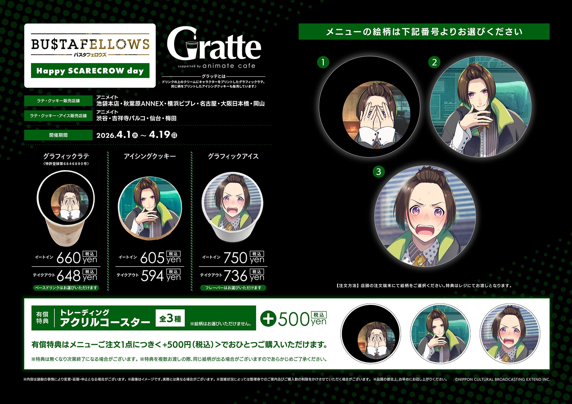 ※飲食のご提供、商品、特典などは、お品切れの際に再入荷する場合もございますが、数量なくなり次第終了となる可能性もございますので予めご了承ください。