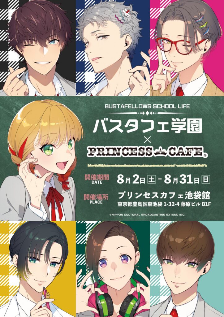 株式会社⽂化放送エクステンドは、ゲーム「BUSTAFELLOWS」のコラボレーションカフェ「バスタフェ学園」を、8月2日から池袋・プリンセスカフェで開催します。